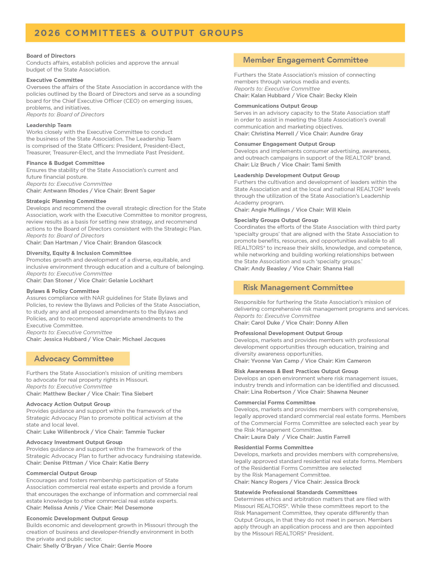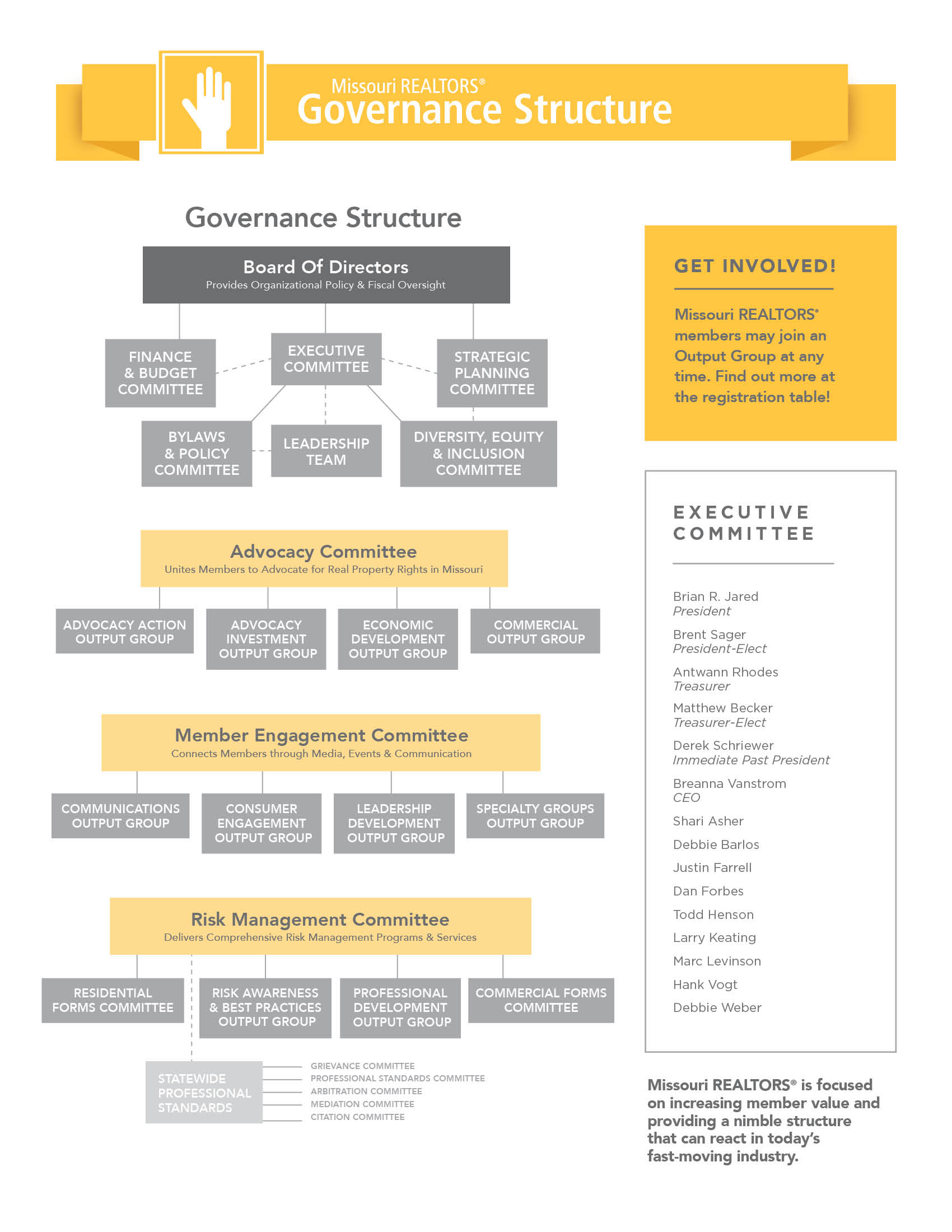 Explore the governance structure and get involved by joining a committee or applying for a leadership position. If you have questions, contact Cara Harmon, Vice President Communications and Member Engagement at cara@morealtor.com or 573‑445‑8400 ext. 1170.